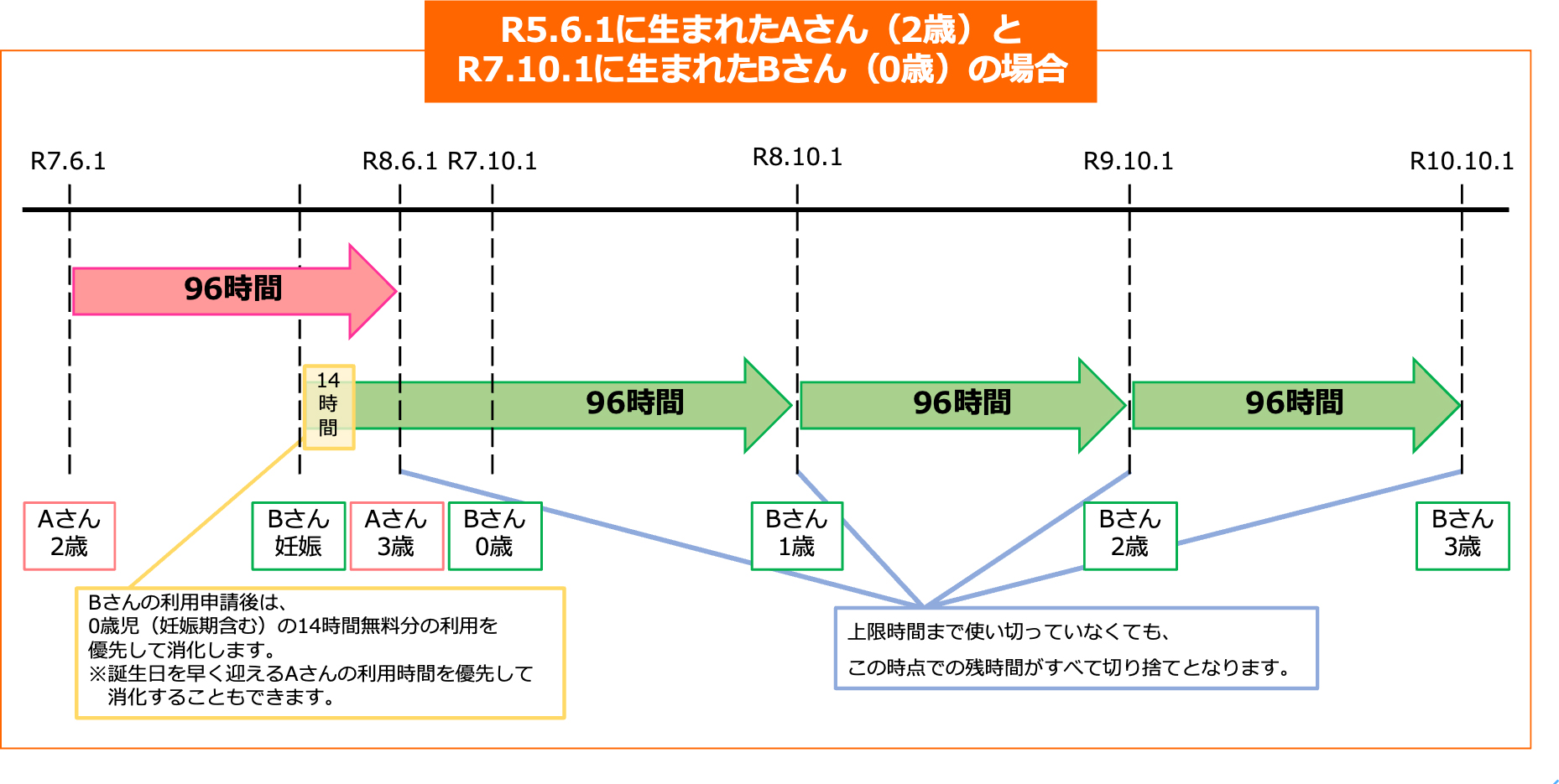 0歳を含む対象児が複数いる場合、0歳児(妊娠期含む)の14時間無料分の利用を優先して消化します。